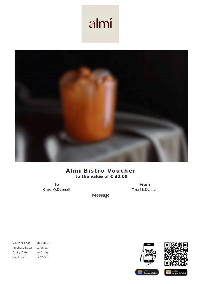 Almi bistro allows you to purchase instantly printable gift vouchers, special offers and tickets using the Voucher Connect platform.